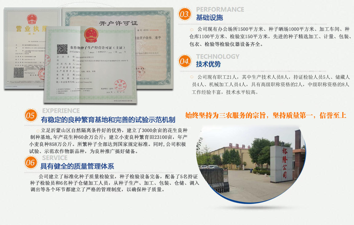 公司具有健全的質量管理體系,較強的技術力量,并建立了標準化種子質量檢驗室,種子檢驗設備齊全。配有良好的基礎設施和種子生產加工設備,有穩定的良種繁育基地和完善的試驗示范機制,F有職工21人,工作經驗豐富,技術水平較高。多年來,始終堅持為三農服務的宗旨,堅持質量第一,信譽至上的經營方針,以優質的服務和過硬的種子質量嬴得了廣大農民朋友的認可。為促進當地農業發展作出了一定的貢獻。